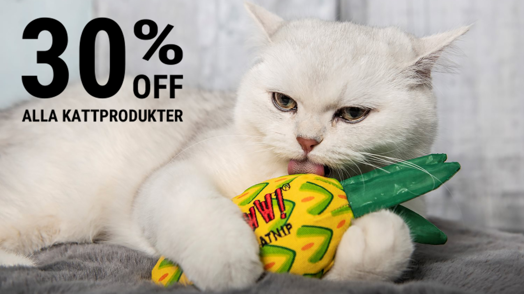 Passa på att fynda – 30% rabatt på alla KATTPRODUKTER. Här hittar du allt från roliga kattleksaker, kattbäddar, kattsnacks, kattmat och andra kattprylar med massor av kattglädje.