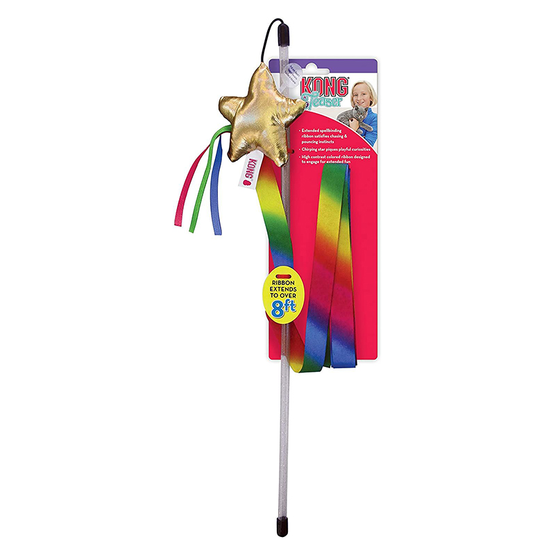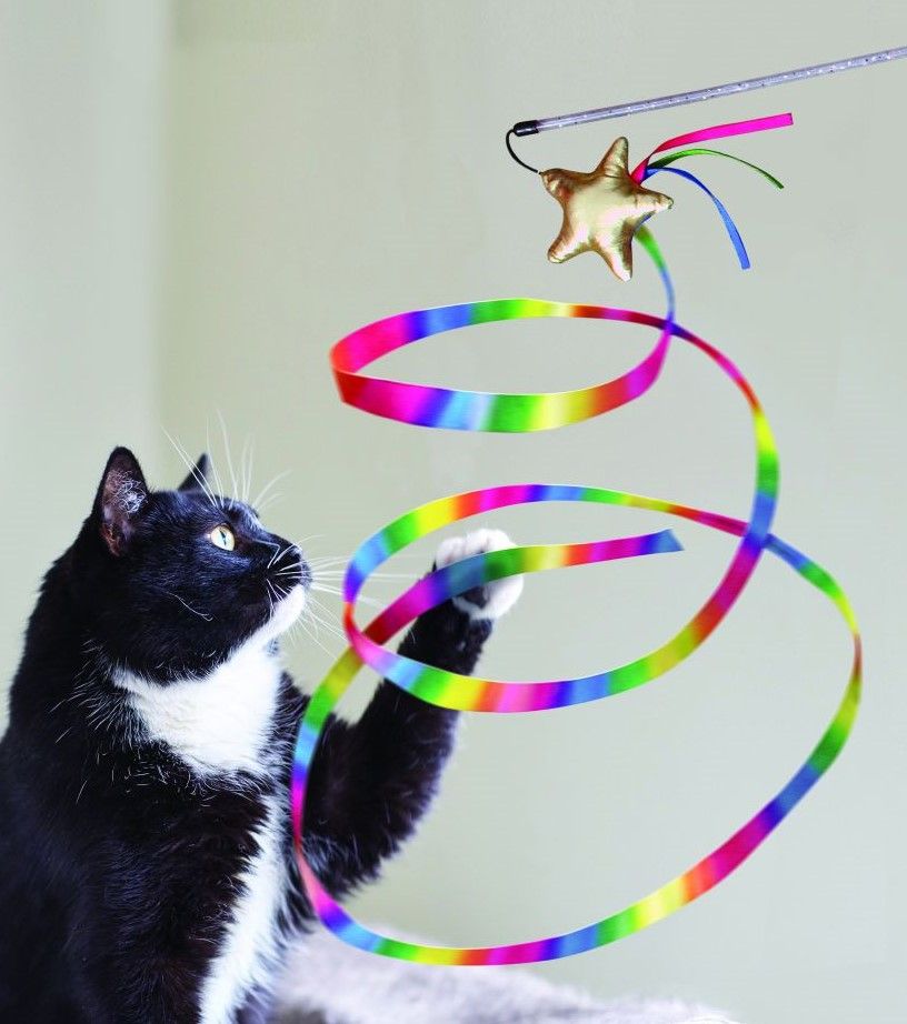 Skojigt kattspö med en guldig stjärna som ger ifrån sig ett kvittrande ljud samt ett lååååååångt band (2,4 meter!) i alla regnbågens färger som katten kan jaga efter och stimulera sina naturliga jaktinstinkter. Lek är roligast tillsammans och ett utmärkt sätt att stärka bandet mellan dig och din katt, samtidigt som ni båda två får ett härligt motionspass. Ta bort plastflärpen från ljud chipet som sitter på stjärnan och jakten kan börja!