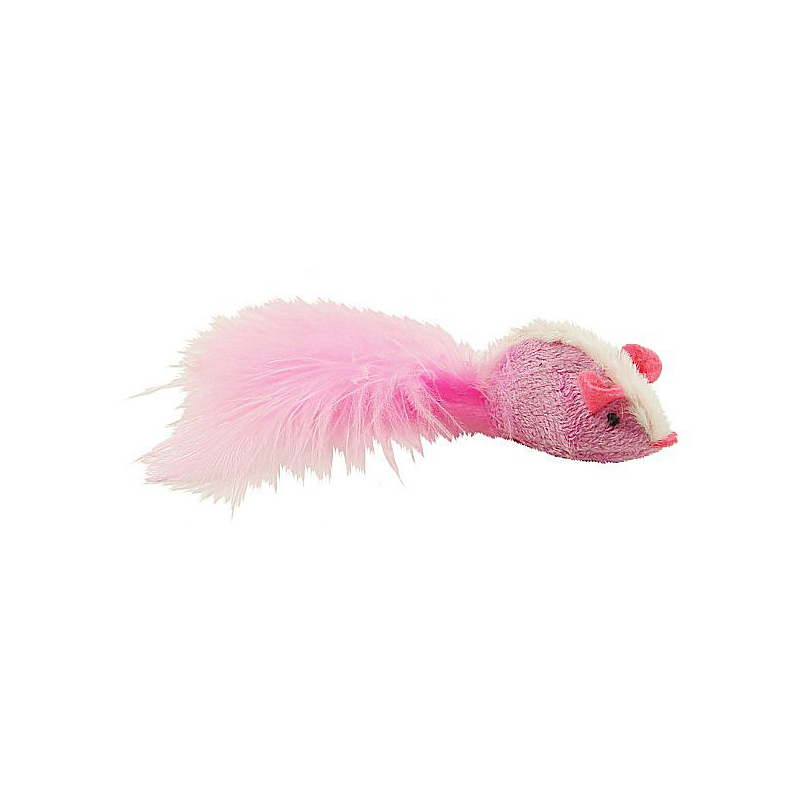Busig liten mus med kattmynta och fjädrar som erbjuder många spännande lekstunder för både stora och små jägare.