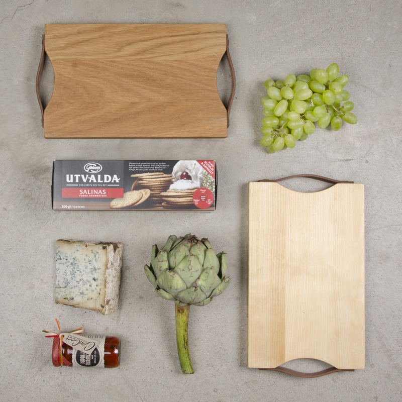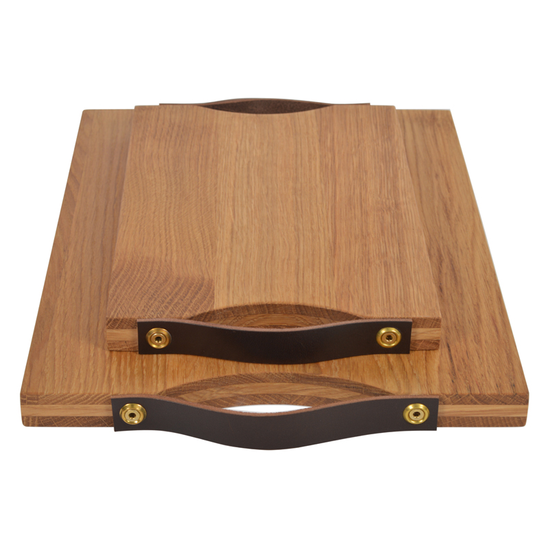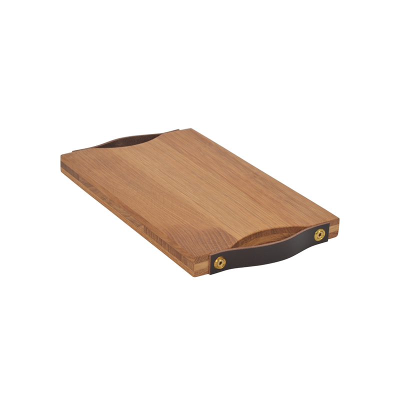 Skärbrädan har praktiska läderhandtag som gör den lätt att bära med sig. Du kan enkelt vända på skärbrädan och använda båda sidorna när du lagar mat. Skärbrädan kan även användas som serveringsbricka för t.ex. ostar, kallskuret eller frukt. Tillverkad i massiv ek i tre skikt vilket gör att den håller formen bättre. Perfekt för dagligt bruk. Skärbrädan är inoljad med en livsmedelssäker olja.