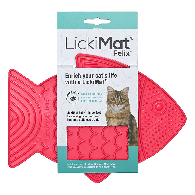 LickiMat är en unik slickmatta som berikar matstunden för din katt. Designen är utvecklad så att katten ska slicka i sig maten vilket lugnar ner ätandet, minskar stressbeteenden och ökar sysselsättningen. Slickandet har dessutom en lugnande effekt och frigör välgörande hormoner. Mattan är perfekt för godis, paté, kokt torsk eller torr-, våt- och färskfoder. Den ökade salivproduktionen har en god effekt på både munhälsan och matsmältningen.